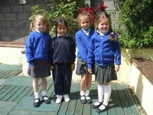 Our uniform consists of a grey skirt or pinafore, sky blue shirt and v-necked jumper from Grants (see below). Girls may wear grey slacks from Hallowe’en to Easter. It is very important that the girls wear solid, “sensible” shoes or boots with white socks, tights or stockings. These can all be purchased in town between Dunnes, Marks and Spencer, Penney’s, Debenhams or Arnott’s. For safety reasons, as the school is spread over 3 floors, we strongly discourage the wearing of flimsy footwear or loose, oversized, shapeless boots. Velcro fastened shoes also save lots of time and frustration, especially in Junior Classes.